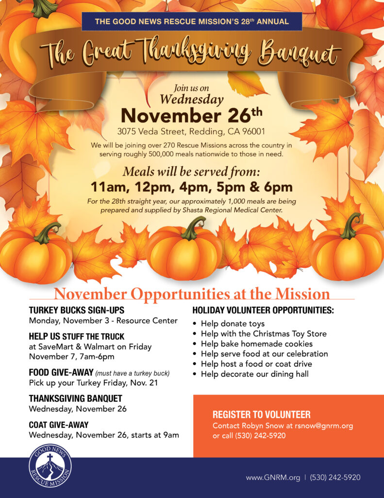 We’ll be joining over 270 rescue missions across the country in serving roughly 500,000 meals nationwide to those in need. Shasta Regional Medical Center will be supplying and preparing our meals. Join us for a meal or volunteer to serve meals, help in our kitchen or pie station, or be one of our welcoming table hosts and eat a meal with our guests. Contact Robyn Snow to volunteer at (530) 242-5920 or email rsnow@gnrm.org.