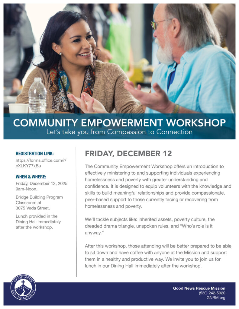 These workshops are designed to help equip you to effectively build relationships and provide peer support for men and women experiencing homelessness and poverty. After this workshop you’ll be better prepared to be able to sit down and have coffee with anyone at the Mission and support them in a healthy and productive way.