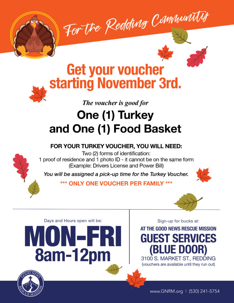 Get a Turkey Buck Voucher to pick up your Turkey and Food Basket in time for Thanksgiving.